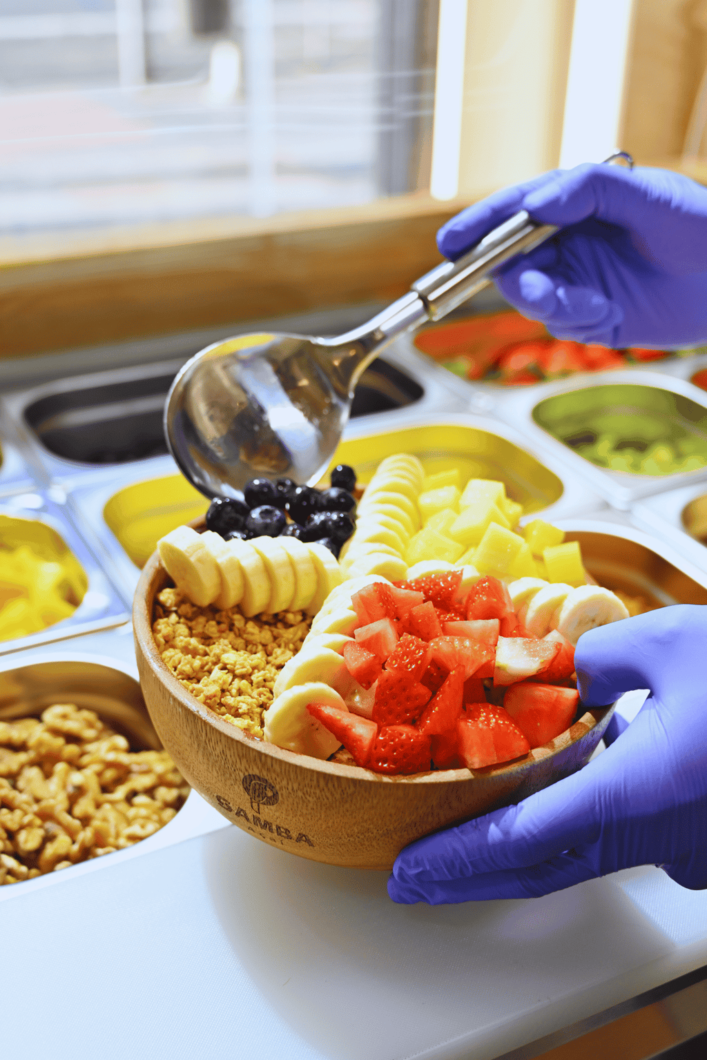 Ingredientes: Base de açai, yogur griego, granola, fresas, piña, nutella y coco.