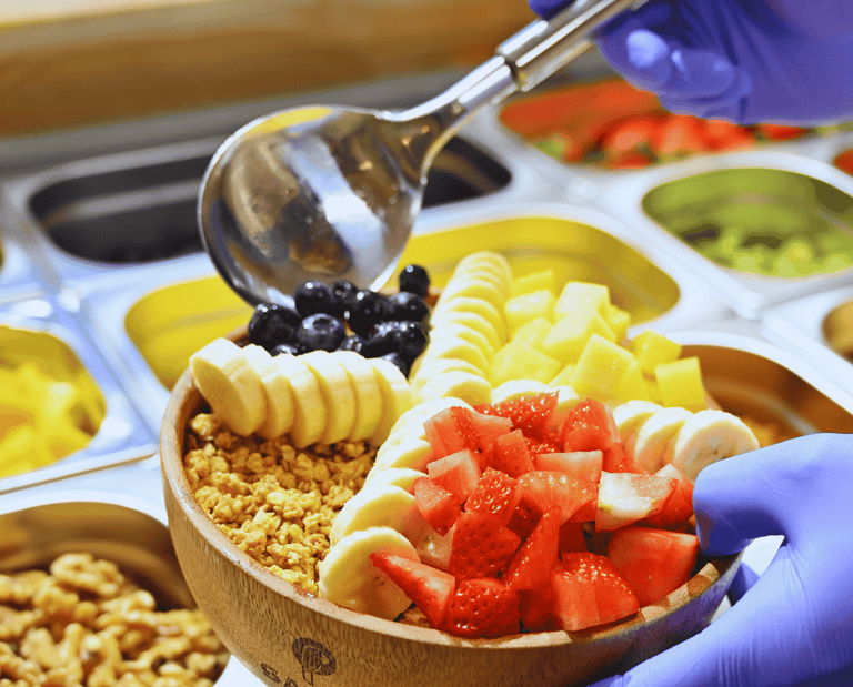 Ingredientes: Base de yogur griego, granola, platano, fresas, arandanos y frutos secos.